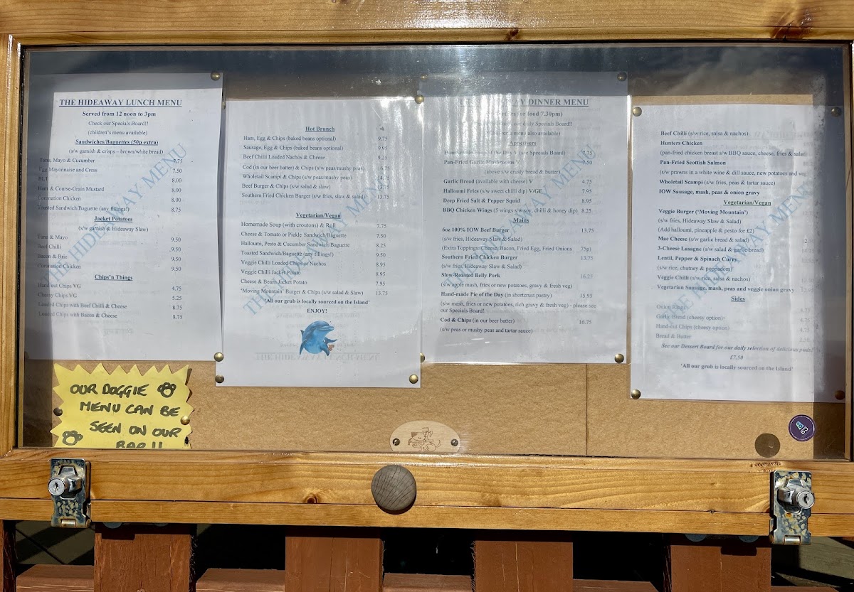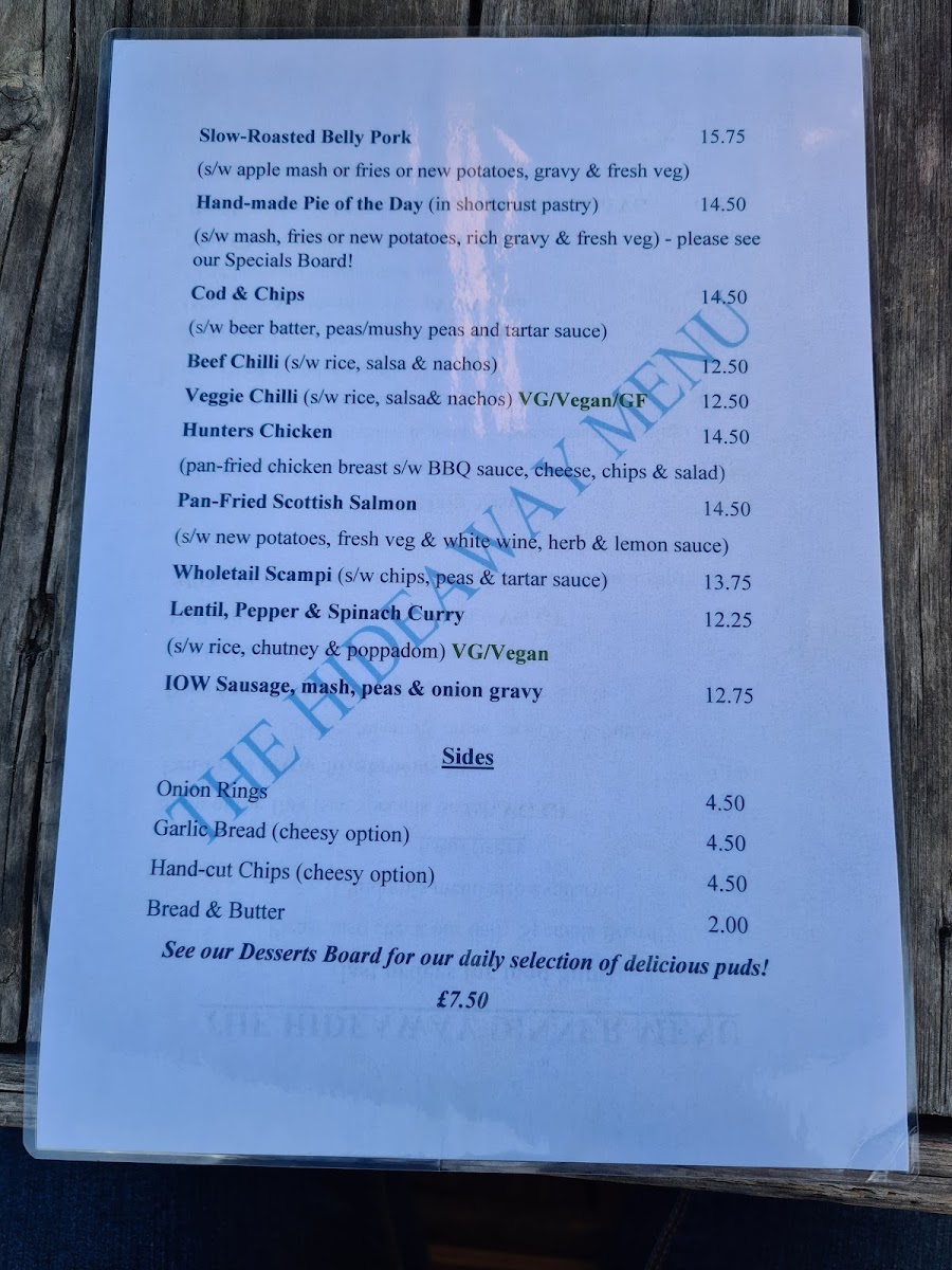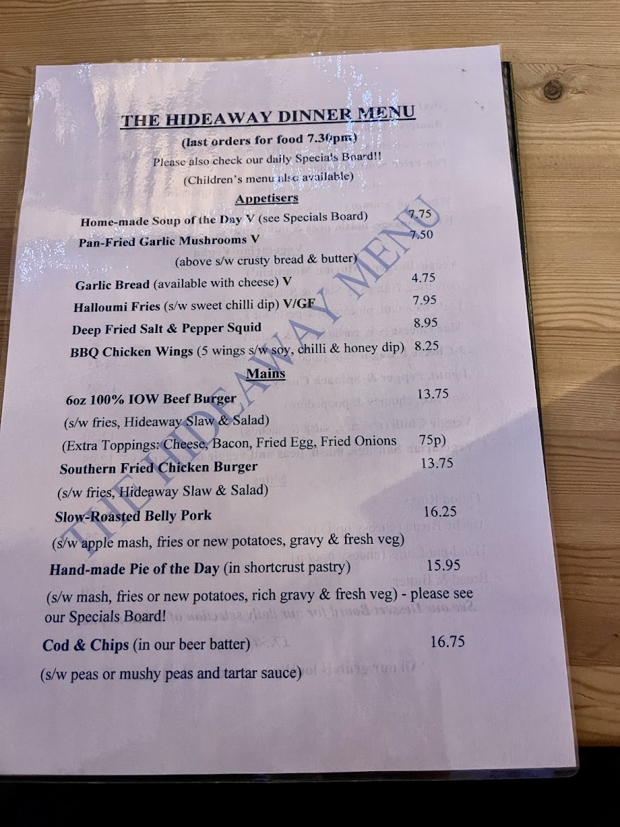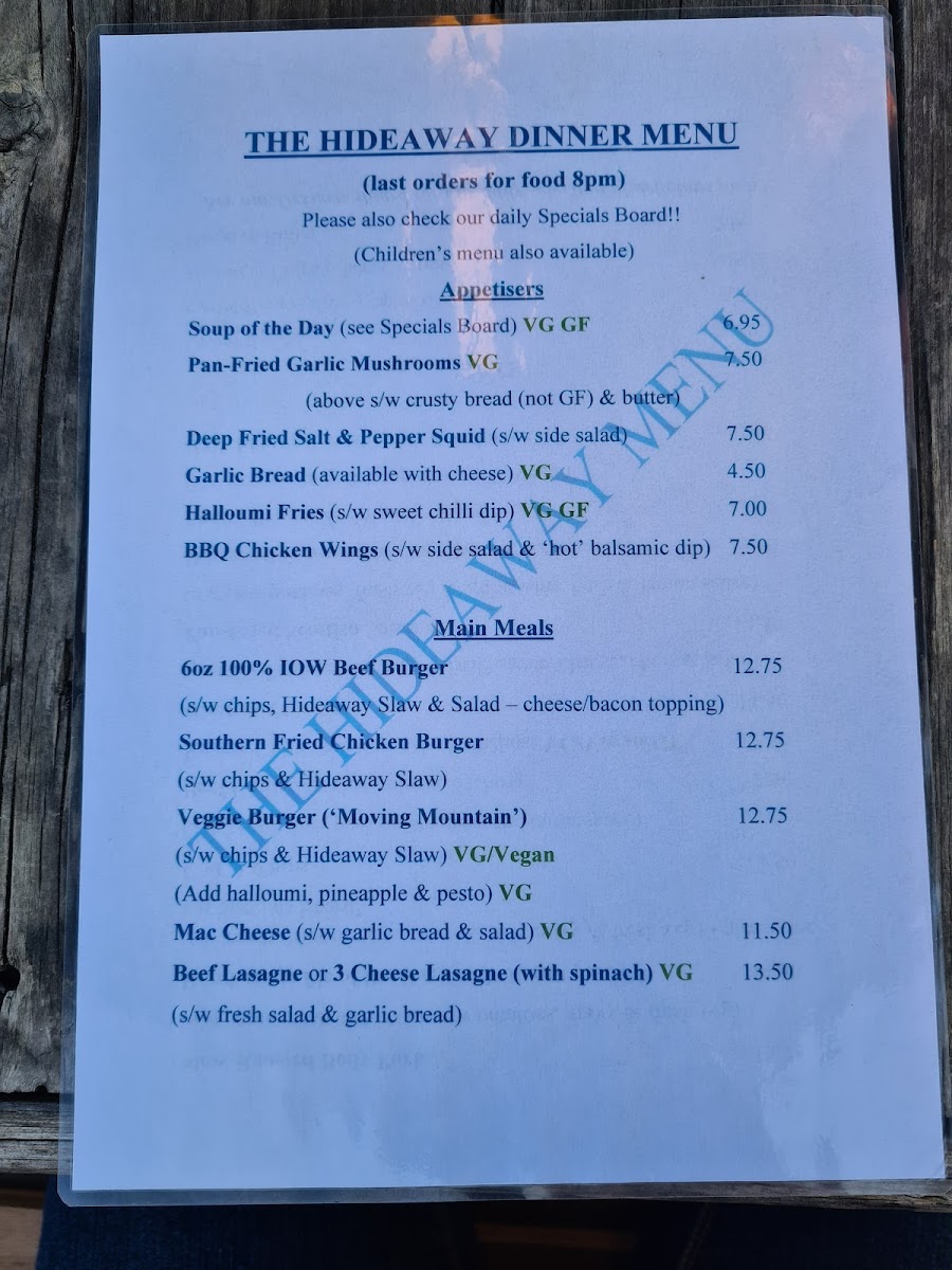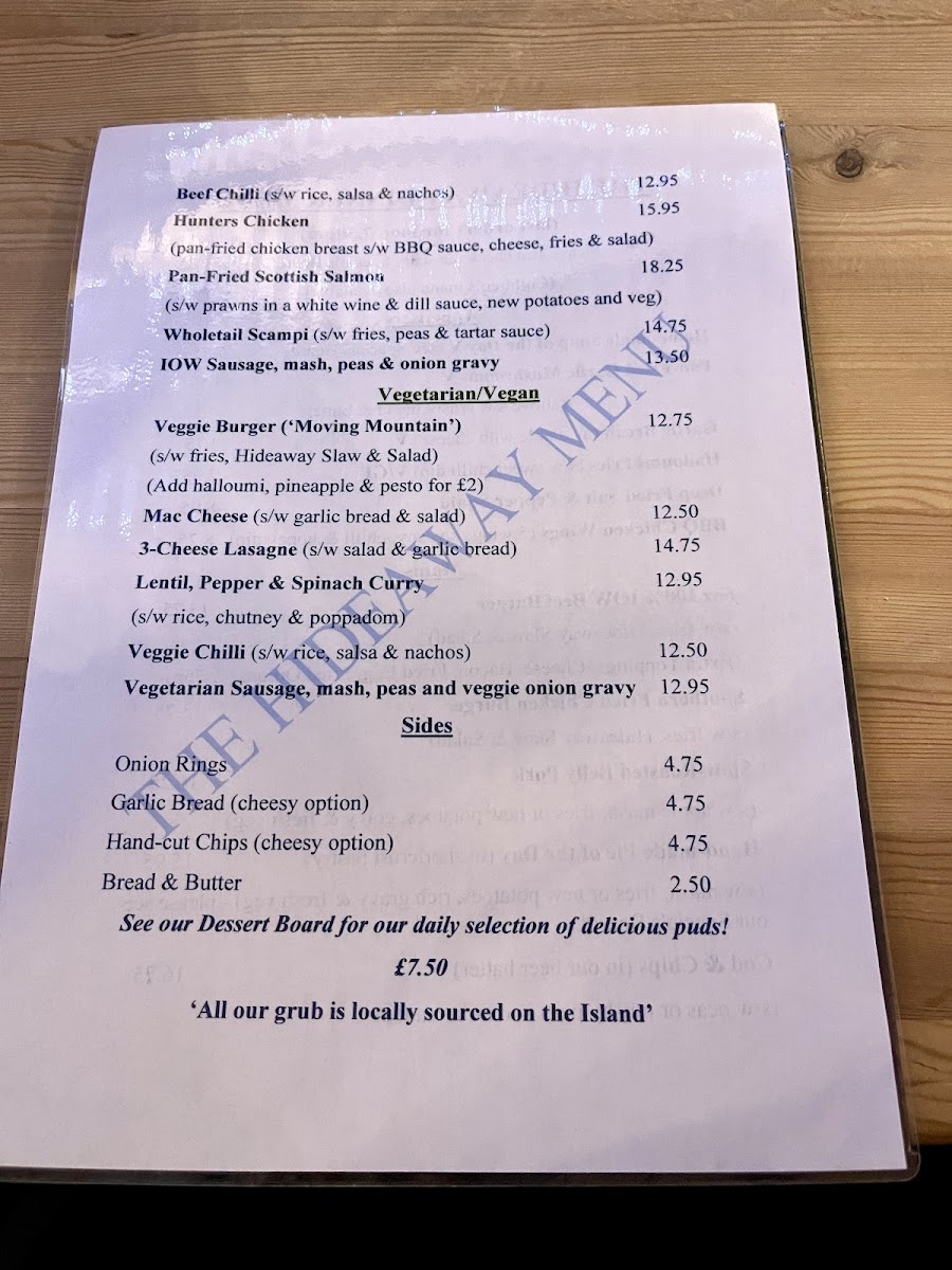 Welcome to The Hideaway - St Boniface Cliff Rd, a charming gem nestled on the coastal path in Shanklin, United Kingdom. This delightful eatery offers an inviting menu that caters to a range of tastes, featuring an array of vegetarian options alongside hearty meals. Highlights include the Homemade Soup served with croutons, and the unique Moving Mountain Burger for a satisfying dinner. For lighter fare, enjoy Halloumi Fries or Deep Fried Salt & Pepper Squid. The venue's cheesy chips and hearty Veggie Chilli dishes are perfect for sharing, making it an ideal spot for family and friends.